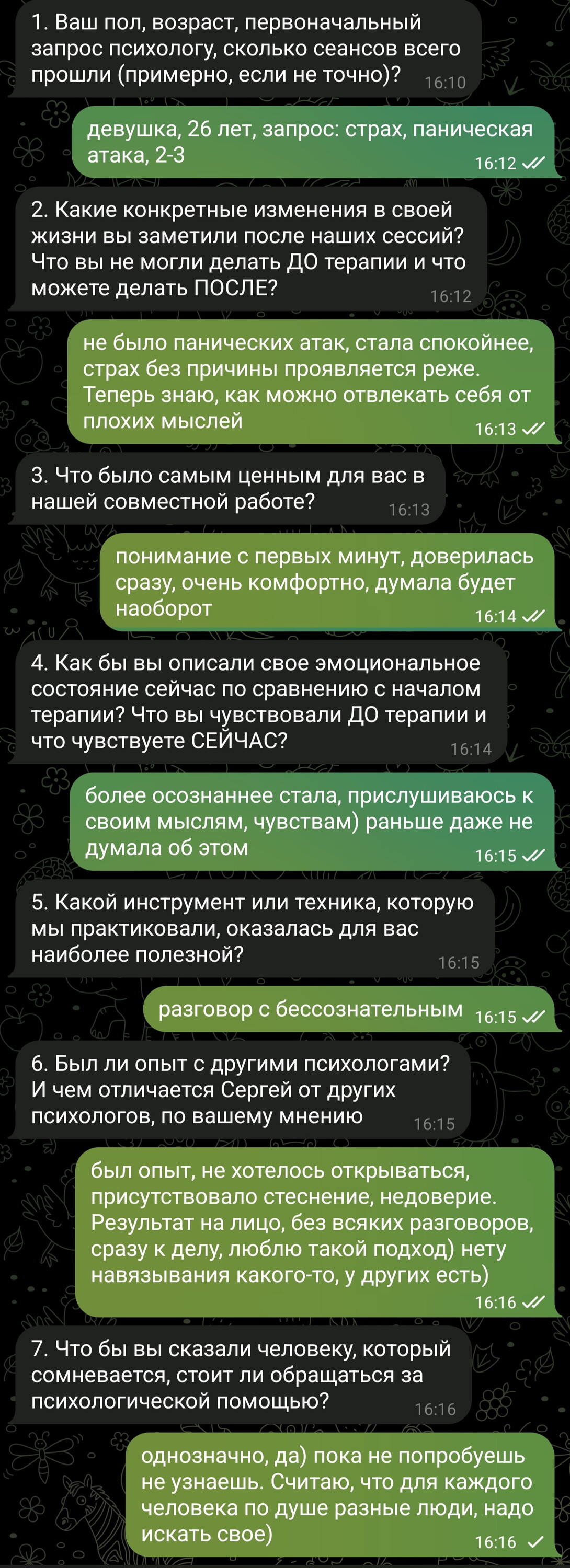 Спачибо вам Сергей, вы помогли мне избавиться от панических атак, я уже и не верила, что это возможно, но после вашей помощи, всего за 4 сеанса, свершилось чцдо! Теперь я не боюсь выхожить на улицу и просто гулять!!!! Я так счастлива!🔥🔥🔥